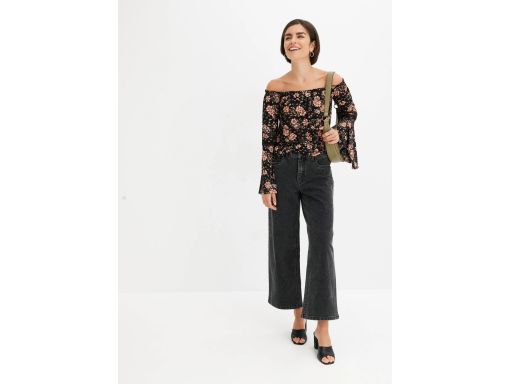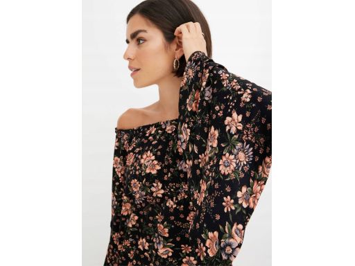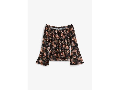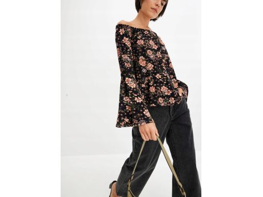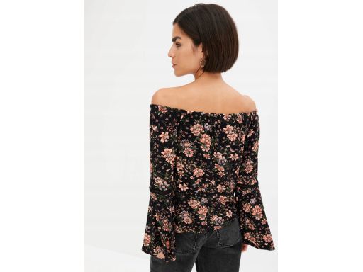 B.P.C czarna bluzka carmen z nadrukiem w kwiaty rozszerzane rękawy r.3