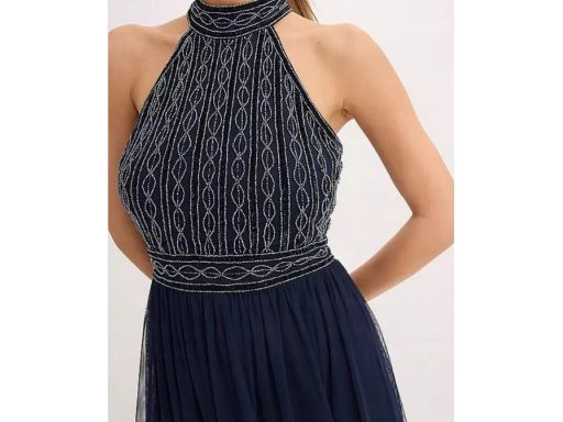 B.P.C długa sukienka wieczorowa granatowa z koralikami 38.
