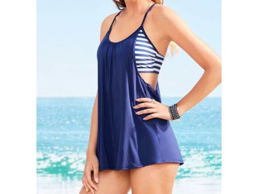 - kolor granatowy z krótkim topem, biustonoszem granatowo-białym w paski