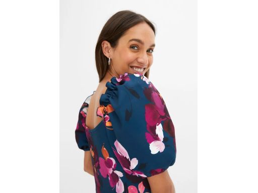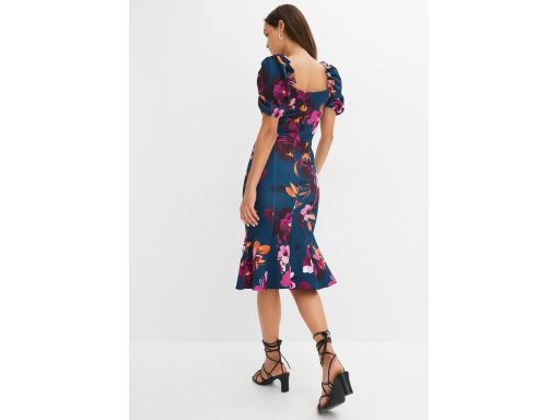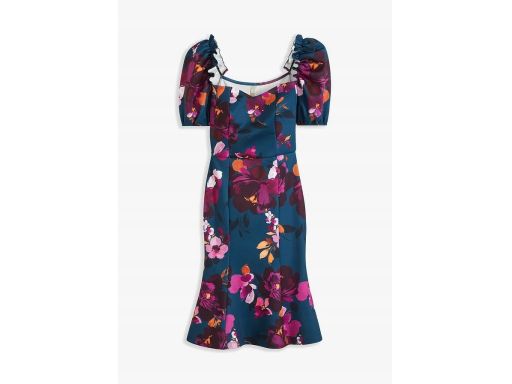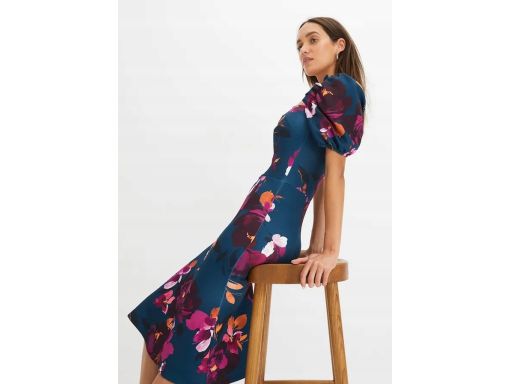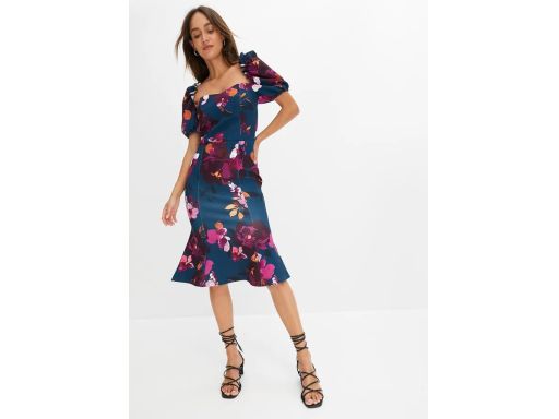 B.P.C sukienka ciemny turkus w kwiaty z bufiastymi rękawkami r.36/38