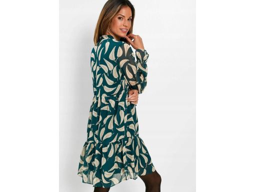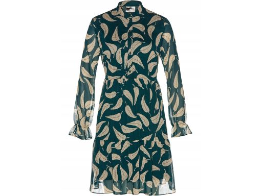 B.P.C. szyfonowa sukienka ze stójką zielona w beżowe listki 36.